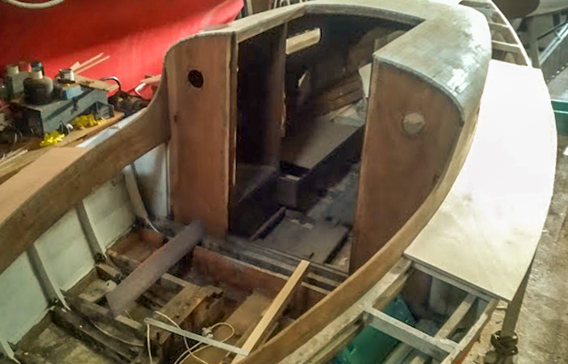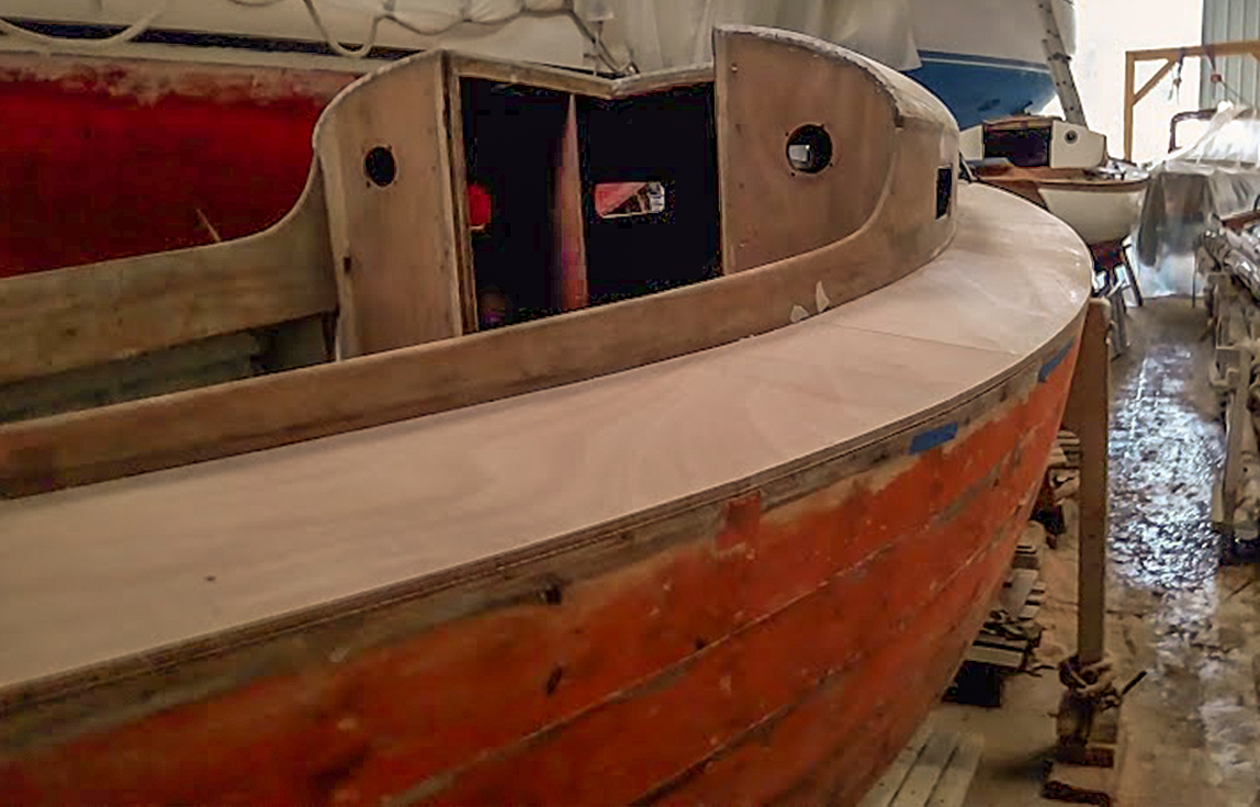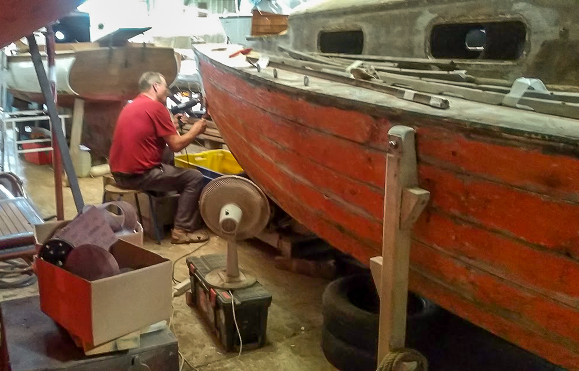 Septembre 2024Un stagiaire de l'AFPA procède à de petites réparations sur la préceinte tribord.