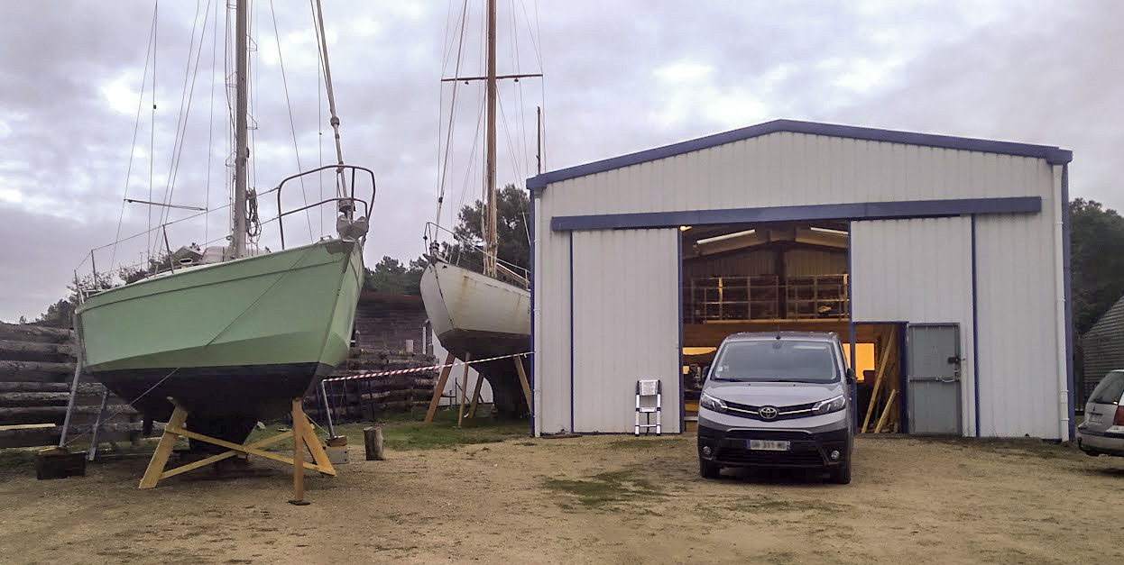 Ce hangar dispose d'un terre-plein de 850 m² où sont actuellement calé plusieurs bateaux dont le plan Alden de 1958 Mistral, notre yawl de 42' dont la restauration vient de commencer.